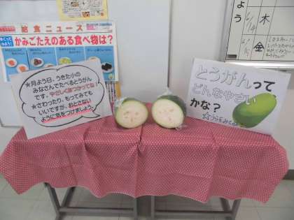 先週の金曜日から2階の栄養黒板の前に実際に使用するとうがんを飾り、子供たちに触ったり、持ってもらったりしました。「なにこれ、重い!」「赤ちゃんと同じくらの重さなんだね」「給食に使う野菜なんですね!」と、みんな興味深々でした。おかわりをしている子もたくさんいました。