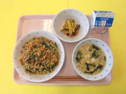 今日の給食の「タンタン麺」は、中華麺に甘い味噌で味付けをした挽肉をのせ、たっぷりの練りごまとラー油などで作る、コクがあって少し辛いスープをかけていただく料理です。本場・中国のタンタン麺はスープがなく、麺にピリ辛のそぼろとタレをかけてからめる「汁なし麺」だそうです。