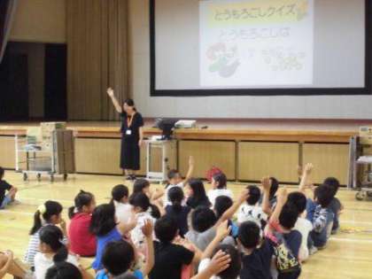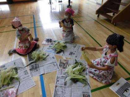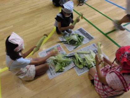 3年生が体育館に集まり、トウモロコシの皮むき体験をしました。