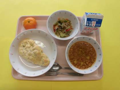 2学期最初の給食は、手作りナンとキーマカレーです。カレーの本場であるインドの人たちは主にナンを食べているイメージがあるかもしれませんが、ナンは「タンドール」という大きな窯で焼いて作るため、お店で買ったりレストランで食べたりするものだそうです。