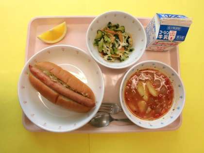 9月になりました。台風が近付いていてお天気は優れませんが、5年生の水泳大会がありました。そのため、今日の給食はみなさんが食べやすい「ホットドッグ」にしました。
