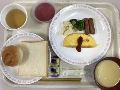 朝ご飯は、パン・オムレツ・ウインナー・温野菜・コーンスープ・ぶどうゼリーをおいしくいただきました。