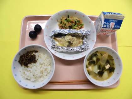 今日の給食では、下味をつけた秋鮭と、マヨネーズで和えたきのこと玉葱をホイルで包み、蒸し焼きにしました。ふっくらと焼きあがった鮭とマヨネーズの相性がぴったりで昨年度も好評だったメニューですが、今年も「美味しい!」という感想をたくさんいただきました。