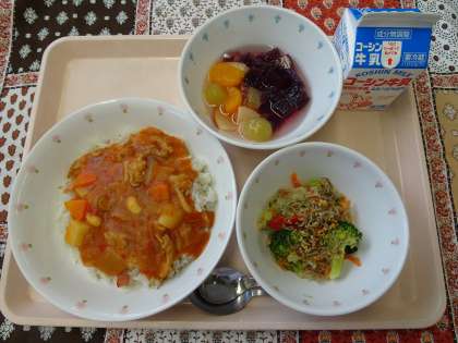 この日は、4年生の「GR給食」として、グレープかんてんパンチを入れました。実は4年生以外の学年でも、フルーツポンチやサイダーを注ぐかんてんパンチをリクエストしてくれた人が多かったので、いろいろ取り入れ、ぶどうジュースを寒天にし、果物と合わせ、各教室でサイダーをそそいでもらう、フルーツパンチにしました。