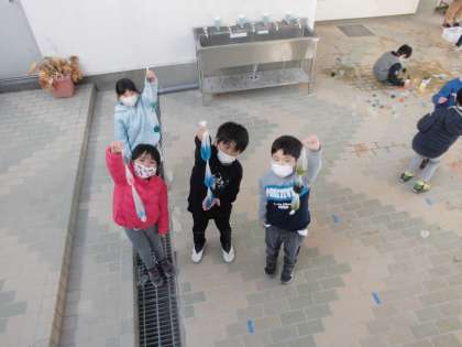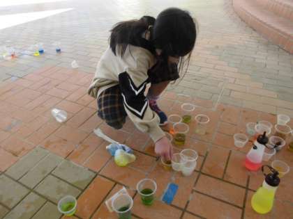 2年生の図工では、色水を混ぜ合わせていろいろな色を作りました。