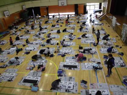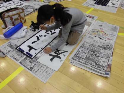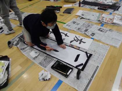 大きな半紙にだるま筆を使って書くのは初めてのことでしたが、どの子も頑張って書いていました。