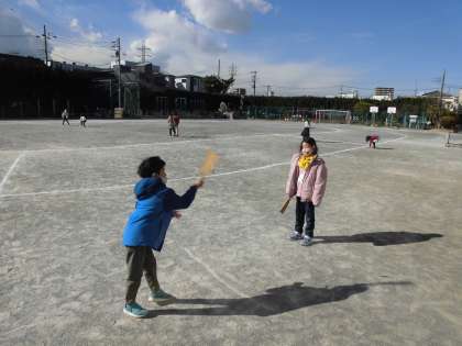 国語「昔の遊び」の授業では、昔から伝わるお正月の遊びについて学習し、羽子板を実際にしました。一人で、何回連続で羽をつけるかチャレンジしたり、友達と何回続くかラリーをしたりして遊びました。