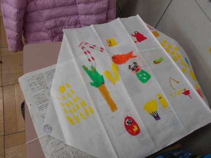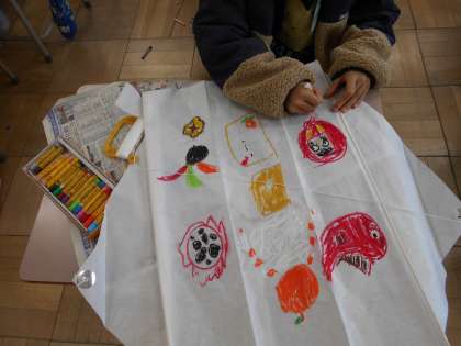 生活科の昔遊びで、たこを作りました。子供たちはも思い思いの絵をクレパスで書いて、たこをつくり、校庭にあげにいきました。風はあまり強くありませんでしたが、思いっきり走ると、とても高く上げることができました。