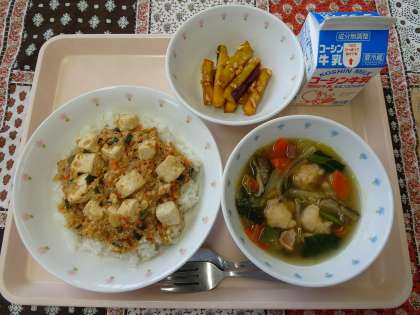 この日は、マーボー豆腐をはじめ、子供たちが大好きなえびだんごスープ、キャラメルポテトと、どの料理もよく食べてくれていました。