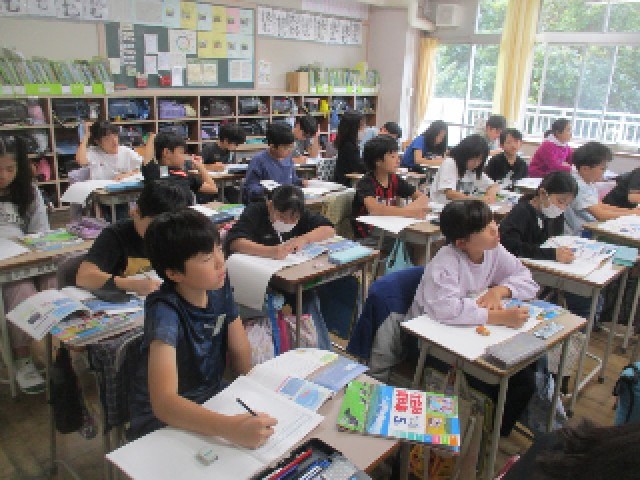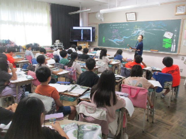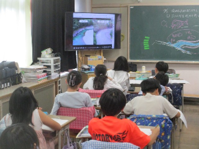 社会科では、カツオ漁を通じて、水産業に携わる人々の工夫について調べるための疑問や調べたいことをノートに記載していました。理科では、流れる水のはたらきについて、川を比較して気付いたことを発表していきます。どちらの授業とも映像資料を活用し、カツオ漁や川の流れを確認していました。