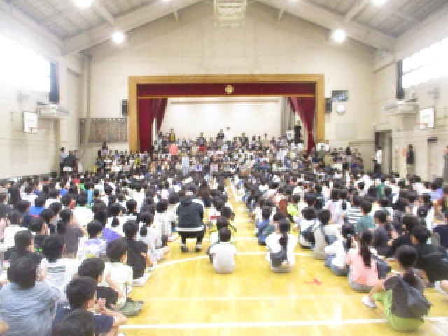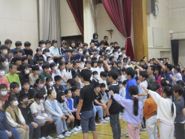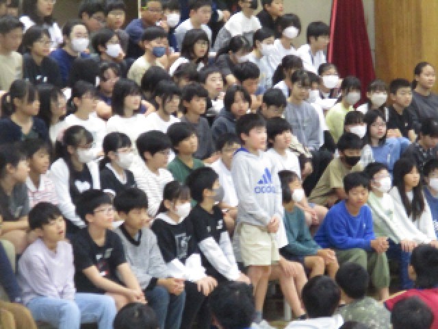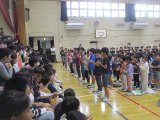 6年生全員が舞台前に整列し、出場種目ごとに紹介をしました。そして、5年生を中心に下級生が6年生にエールを送りました。そして、6年生の代表児童から御礼と決意の言葉が述べられました。