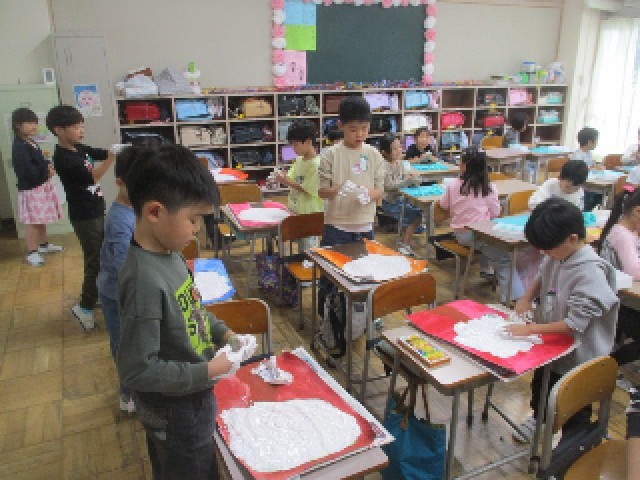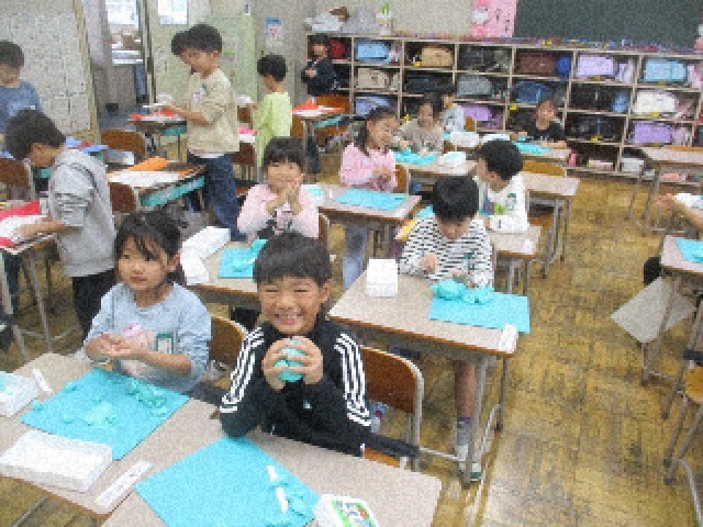 1年生の図画工作科の授業の様子です。画用紙に大きな木を描きどろどろ粘土を手で塗っています。また、油粘土を使い、自分が表現したい立体を作っています。自分の思いを形に表す経験を、そして自分で納得のいく作品作りを大切にしていきます。