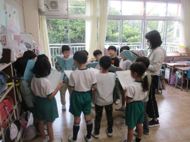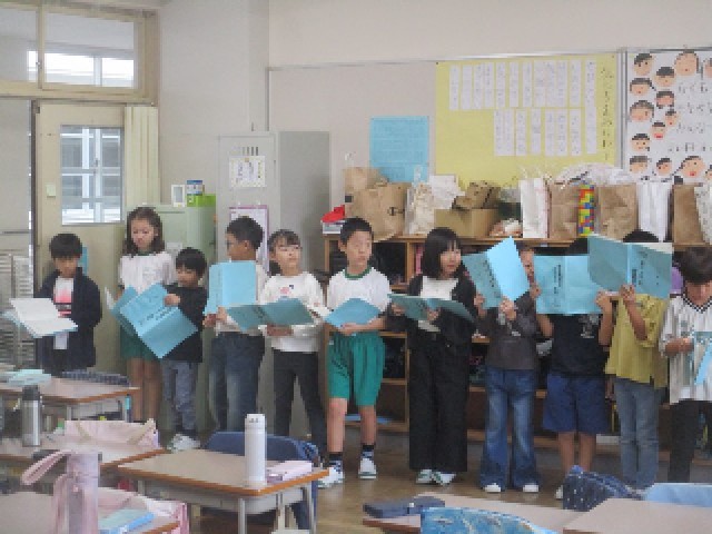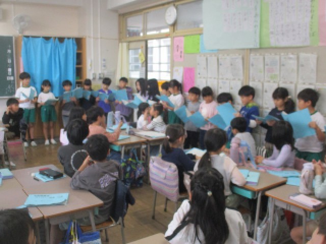 2年生の学習の様子です。11月の学習発表会に向け、学年が3つの教室に分かれ、音楽劇「スイミー」を練習しています。