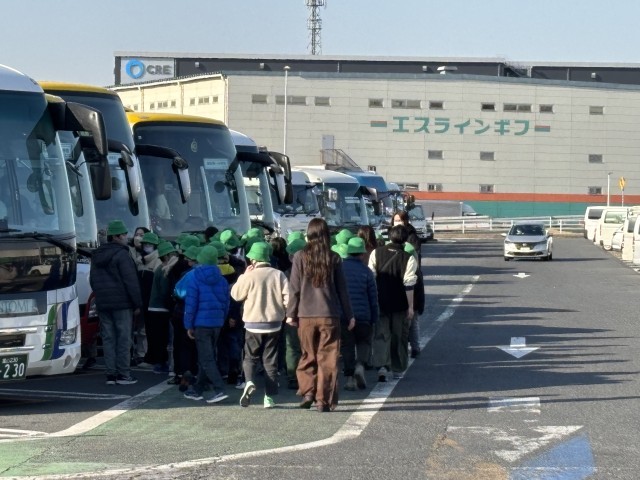 三芳パーキングエリアでトイレ休憩です。この後、学校に向かいます。