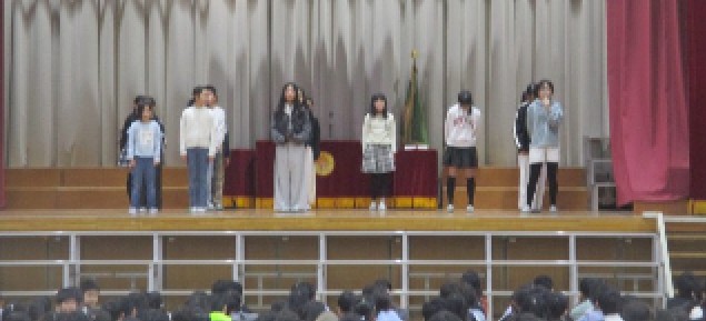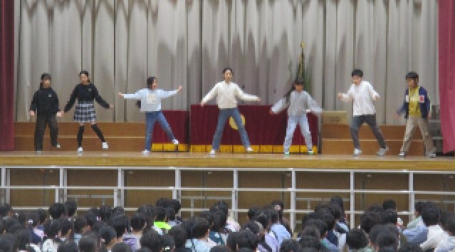 今日の児童集会は、パフォーマンスクラブの発表でした。1年間、クラブ活動の時間に練習してきた成果を全校の前で発表しました。