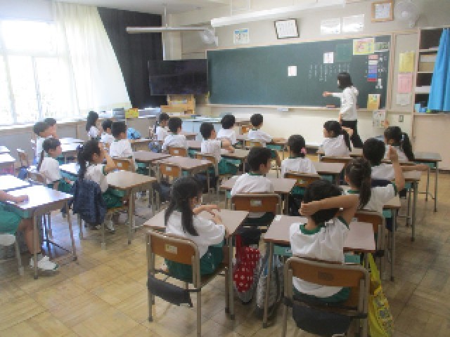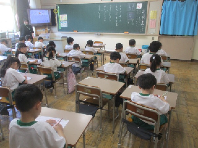 1年生の国語の授業です。ひらがなの「も」を学んでいます。「も」の筆順や「も」が使われている単語などを発表しながらの学習でした。文字を書く時の姿勢が特に素晴らしかったです。