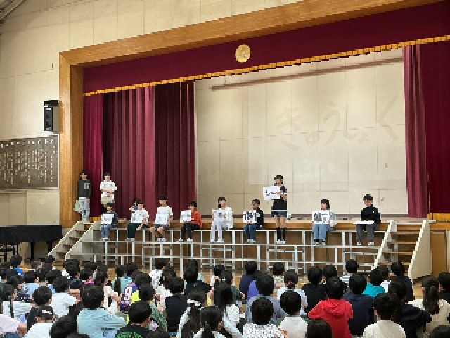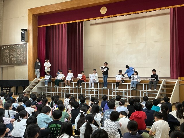 本日の児童集会は、委員会紹介でした。計画、集会、放送、運動、図書、理科、給食、健康、学校環境の9つの委員会に5・6年生全員が所属し、学校をそれぞれの立場でよりよくしていくように取り組んでいきます。集会では、各委員会の委員長からどのような取組を行っていくのかの発表がありました。
