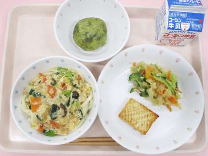 卵とじうどん 牛乳 いかの照り焼き 糸寒天の和え物 小松菜お芋あんまん です。
