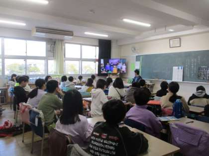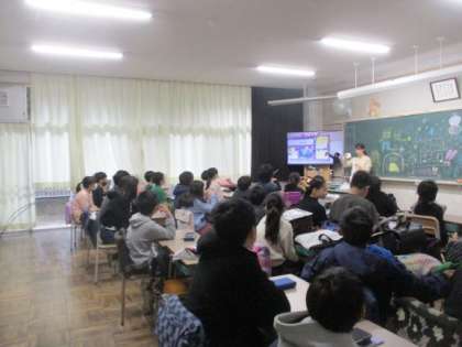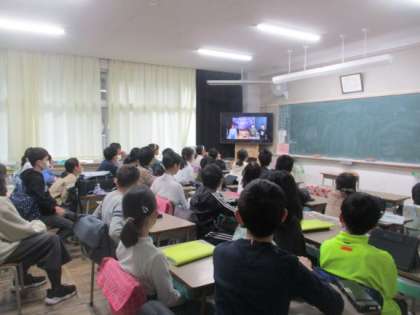 今日の放送集会の様子です。今日はオリ・パラ委員会の発表です。聴いているのは昨日ウインタースキールから帰校した5年生です。