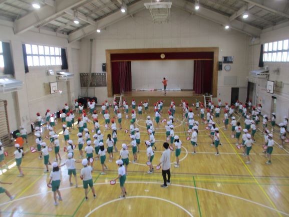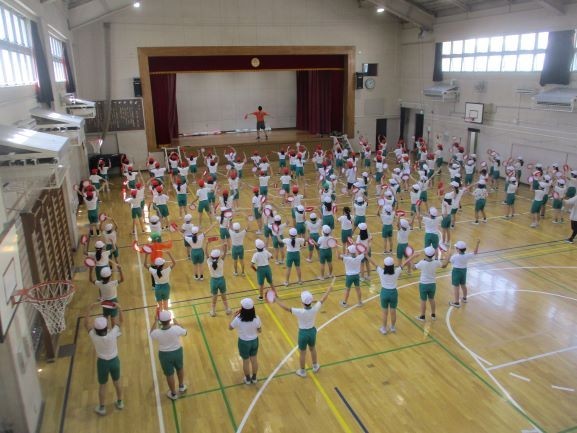 5校時の体育館での4年生、校庭での6年生の運動会練習です。