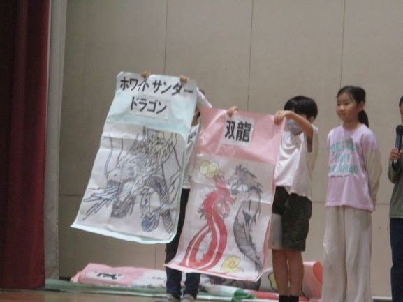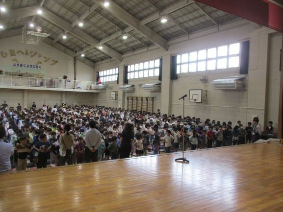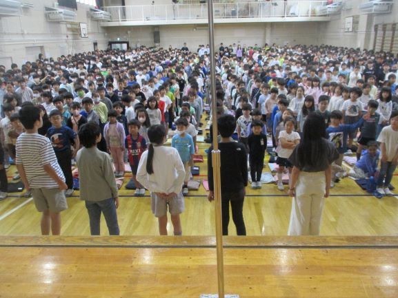 今日の全校朝会の様子です。整列、6年生による挨拶、生活委員会から運動会のスローガン決定の報告とマスコットキャラクターの発表です。