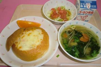 シチューパン・ミートボールスープ・トマトサラダ・くだもの・牛乳