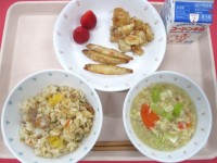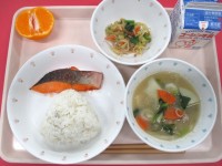 ご飯・鉄火みそ・いなだの照り焼き・アーモンドあえ・けんちんじる ・ぎゅうにゅう