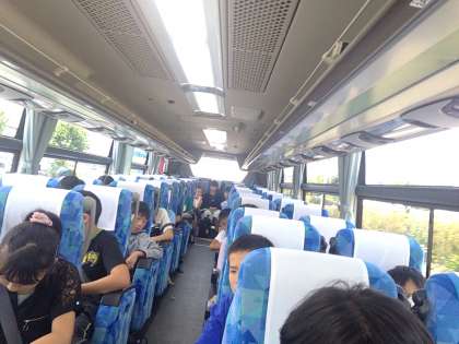 バスの?で説明を聴きながら、メモをとる6年生です。