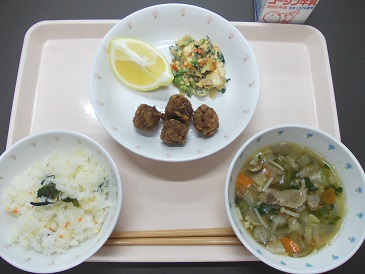 きびごはん・くじらの竜田揚げ・生揚げと小松菜の卵とじ・