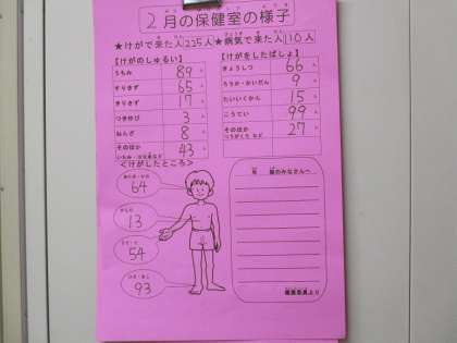 今日、委員会活動があり健康委員会がまとめた、2月の保健室の様子です。