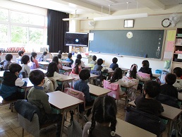 読み聞かせボランティアの方たちによるビデオによる読み聞かせを1年生が見ている場面です。作品のクオリティーが高く、見終わった後の1年生から、「映画みたい」という感想が思わずきかれました。放送による読み聞かせに続き、また、引き出しが広がりました。来年度の活動にも広がります。