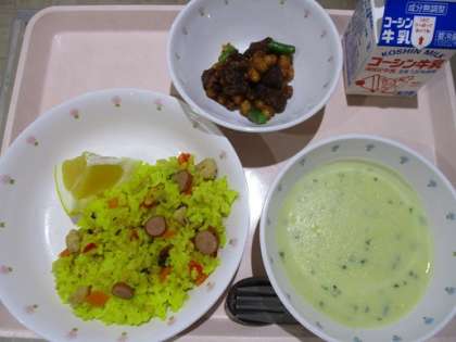 レンズマメのピラフ・レバーとお豆のケチャップあえ・