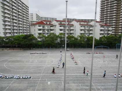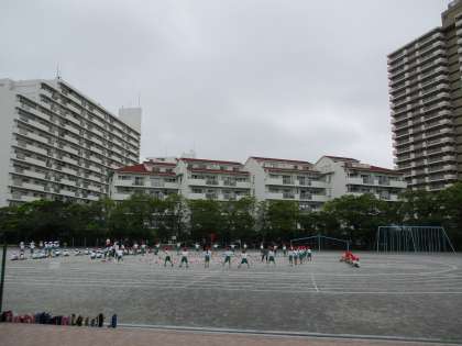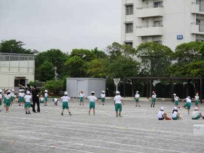 第3校時、校庭での運動会練習です。学年種目「おどってなげてポンポンポーン」の練習です。