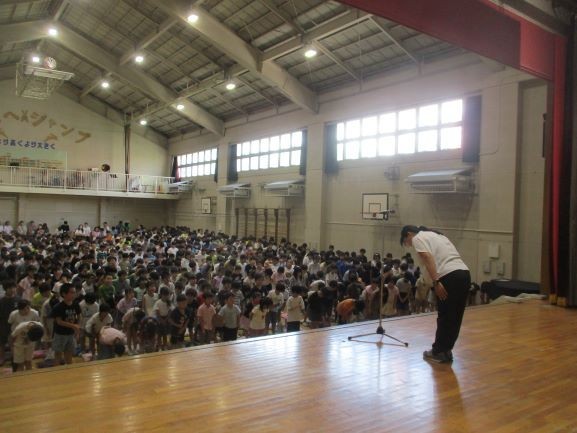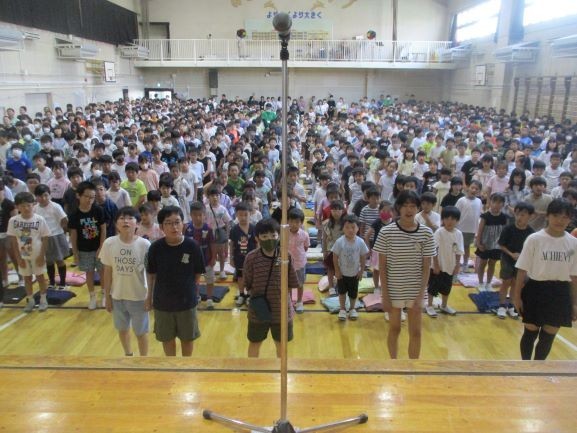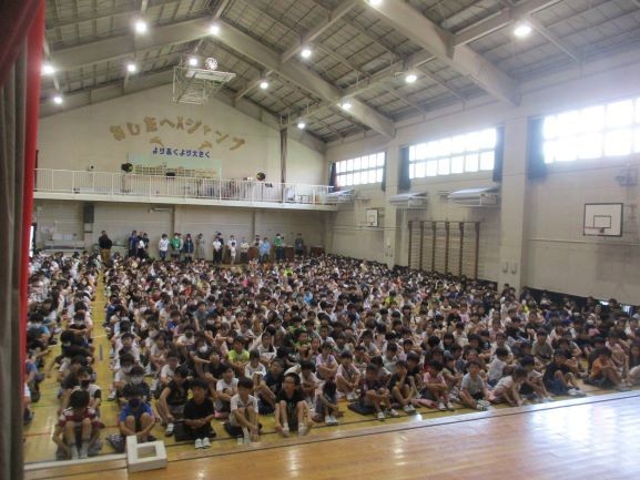 今日の全校朝会の様子です。8時20分前のチャイムの前に全員集合・整列完了ができました。