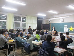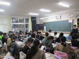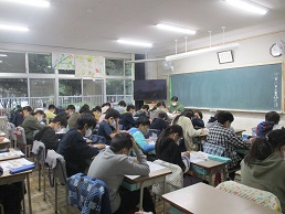 6年生の1校時の授業です。上から外国語科、社会科、最後のクラスは、移動教室に向けてしおりの閉じ合わせをしたいました。