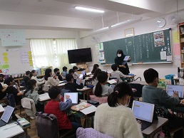 3校当時の4年生2クラスの授業です。上からタブレットを使っての国語の授業です。もう1クラスは学期末で返却するものを協力して配布していました。