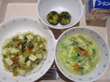 マーボーどうふどんぶり・たまごスープ・ 豆腐入りかぼちゃ白玉のごまだれあえ・牛乳