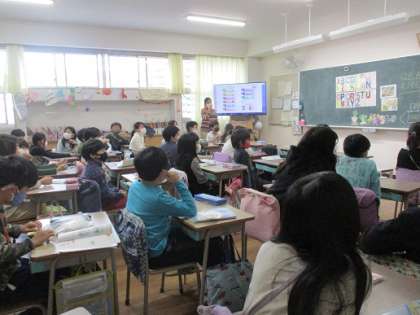 4年生は、外国語活動の授業が徐々にのってきています。5年生からは外国語科となり、教科としての位置づけがたかくなるので、このままいってほしいですね。