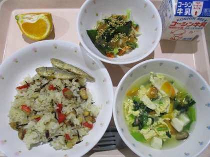 中華おこわ・豆あじのからあげ・わかめサラダ・ふわふわとうふスープ