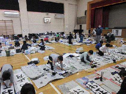 3年生から始まった「毛筆」での書写。初めて大きな書初め用紙に毛筆で書きました。お手本をよく見ながら、丁寧に書きました。