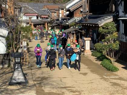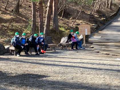 グループ行動の様子です。予定より10分はやく昼食場所に入れてもらいます。