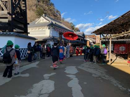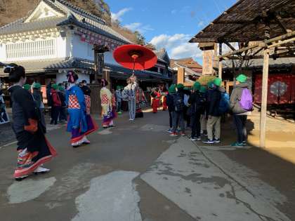 花魁道中を見学する一小の子どもたち。