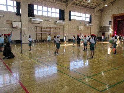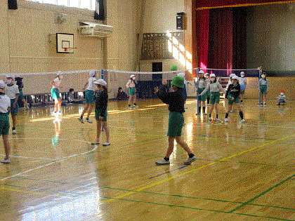 4年生は体育で「バレーボール」につながる対面型ゲームとして「キャッチバレーボール」をしています。