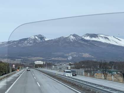 パーキングエリアを出発しました。宿舎まで休憩なしで行きます。雪山が見えてきました。