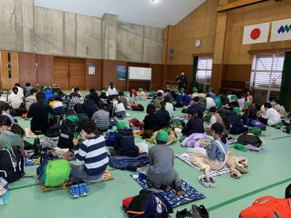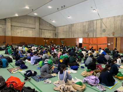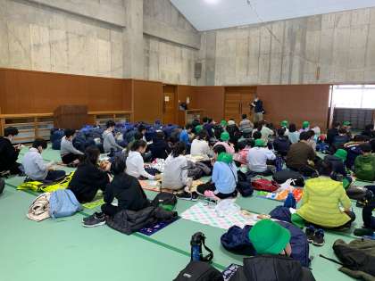 昼食です。黙食です。その後、外でクラス写真。プレイルームで開校式です。