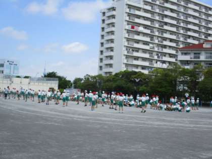 校庭での練習でないと確認はできないので、丁寧に確認していました。写真は2曲目の隊形です。