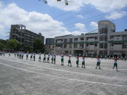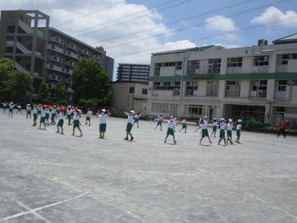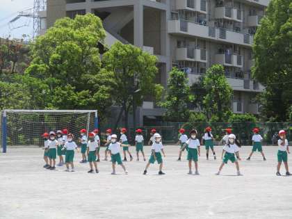 1年生の校庭での運動会練習、学年表現の練習の様子です。
