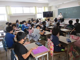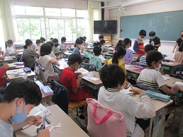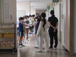 1校時4年生3クラスの授業の様子です。これから校庭に観察に出ようとするクラスは廊下での整列です。この後は静かに移動していました。紙の分度器で校内のもの角度を墓qる準備をしているクラス。最後は音楽科の授業です。