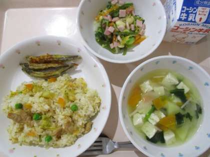 キムチごはん・スパイシーきびなご・くきわかめとハムのあえもの・
