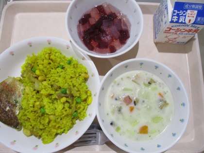カレーピラフ・メバルのハーブやき・クラムチャウダー・